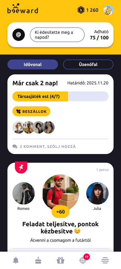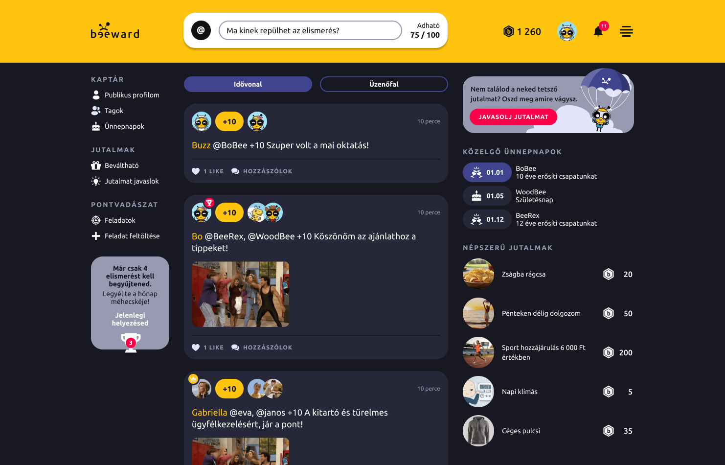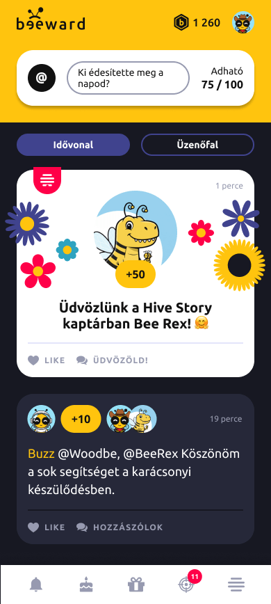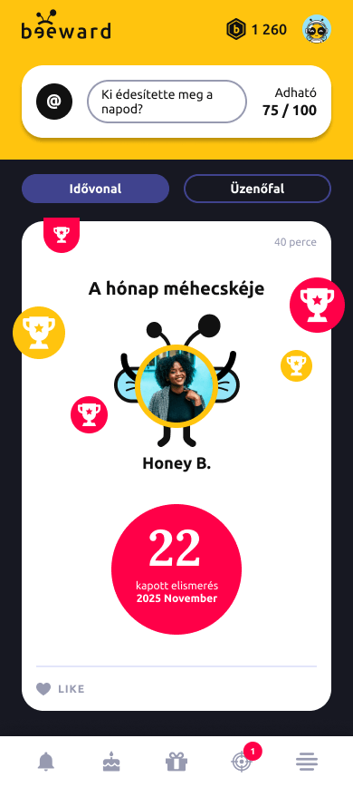Amikor valaki új csatlakozik, a kaptár azonnal értesül róla, és mindenki köszöntheti pár kedves szóval vagy ponttal – így az első nap is pozitív élményként marad meg. A hónap méhecskéjét pedig külön ünneplés kíséri, mert a jó példa megérdemli, hogy látható legyen.