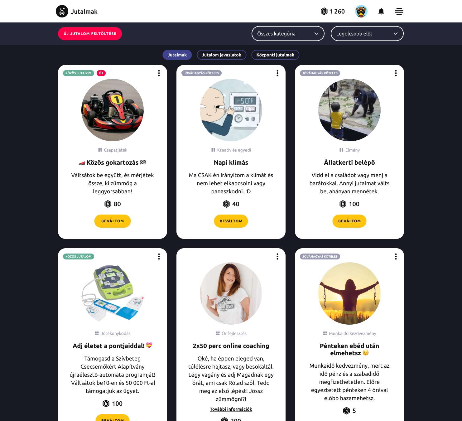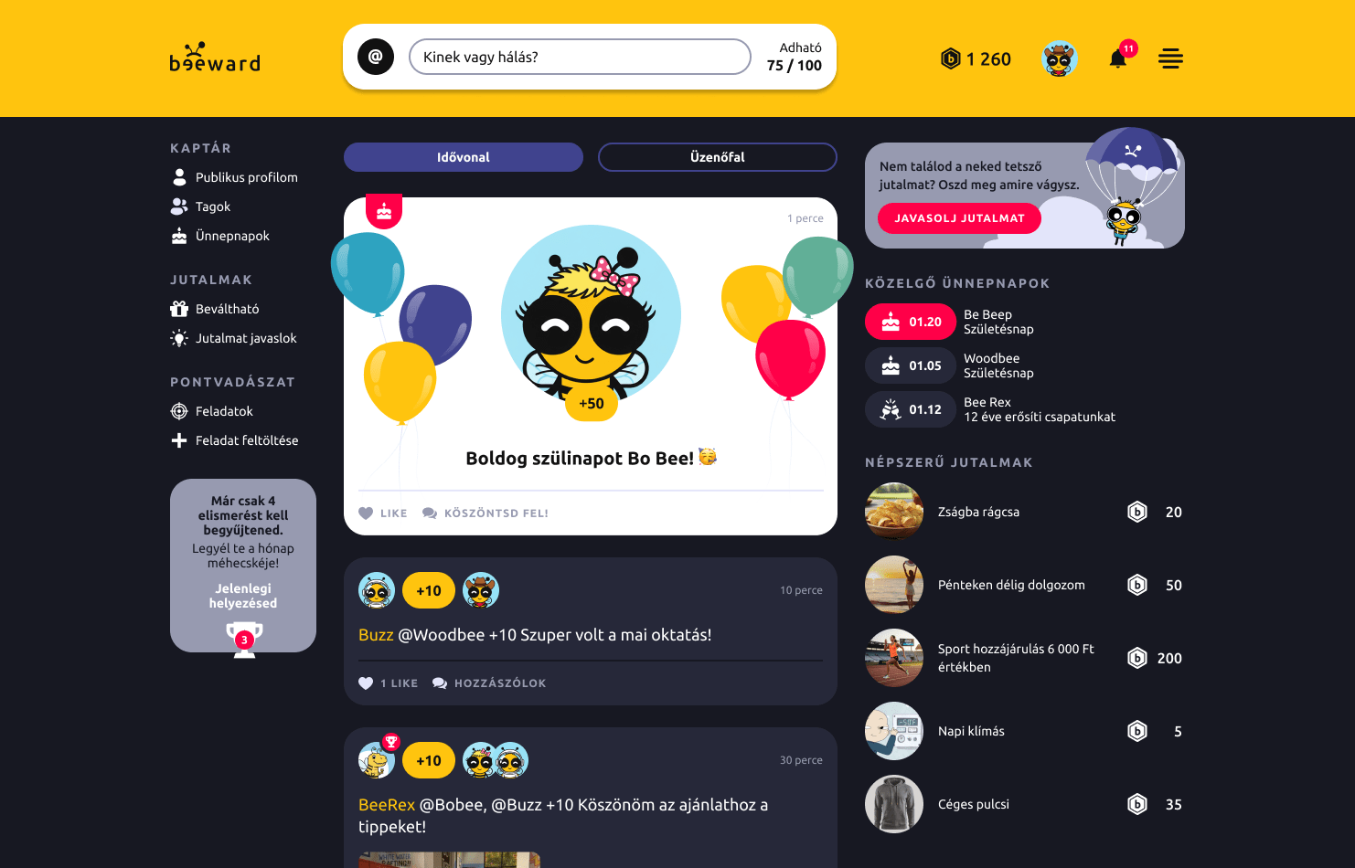 A Beeward központi jutalmai folyamatosan frissülnek, így mindig van új motiváció: jótékony ügyek, extra szabadnapok, közös élmények. A jutalom javaslat pedig lehetőséget ad mindenki számára, hogy név nélkül oszthassa meg mire vágyna.